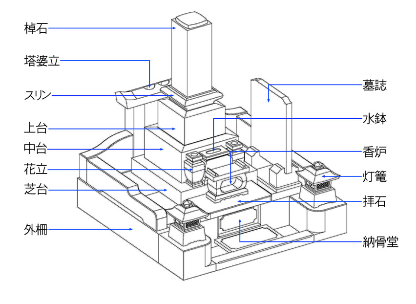 お墓全体を囲う石材の総称で、納骨堂も場合によってはこれに属します。土台部分の補強や隣接墓地との境界線を